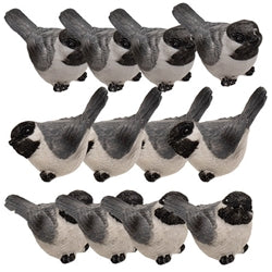Mini Resin Bluebirds are darling decorative accents for spring or everyday displays. Crafted from durable resin, each piece depicts a bluebird with detailed carved design and a flattened bottom for freestanding display. Sold as a set of 12 in an organized wooden crate, 4 birds face down and to the left, 4 face straight forward, and 4 face up and to the right. Each bird features gray-blue painted feathers with a white underbelly and black head and beak. The bluebirds work well as bowl filler or to accent other decor. Each measures 1.5-2” high by 1” wide by 2” deep.