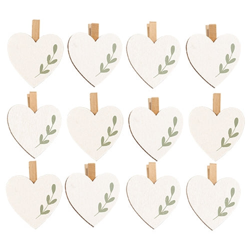 Wooden Leaf Sprig Heart Clips bring a romantic touch to Valentine, special occasion, or everyday decor. Made from wood, each heart features a white finish with green leaf detail. The white space can be written on to label containers or serve as place cards. A clothespin clip attached to the back of each allows for versatile display. Each measures 2.5” high by 2” wide by .5” deep.