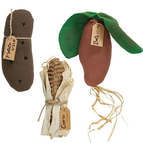 Potato, Corn, Beet Fabric Vegetables sell as a set of three stuffed fabric veggie plushies with felt leaves, corn husks, raffia, and string. They read, "Corn $2/dozen," "Beets 2/$1.00," and, "Potato 3/$1.00" in black text. Vegetables look great on a decorative tray or in a bowl and they measure 6.25" high by 2.5" wide by 1.25" deep (potato); 6.5" high by 2" wide by 2" deep (corn); 6" high by 3" wide by 3" deep (beet).