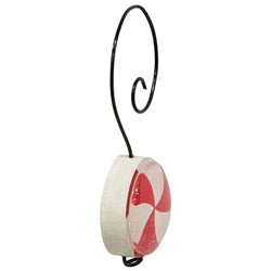 Wood & Glass Marble Peppermint Ornaments add a whimsical accent to a holiday tree or other display. Sold as a set of 6, the ornaments are made of wooden discs painted like peppermint candies and topped with rounded glass. Curly black wire hangers allow for versatile use. Each measures 3” high by 1.25” wide by .5” deep.