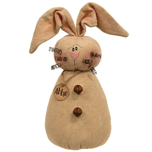 The Abbie Bunny is a decorative plush bunny figurine made with soft ivory linen-style fabric. The rabbit has posable ears, blushed cheeks, bell buttons, curled metal whiskers, and a paper tag reading “Abbie” fastened with a jute string. The bunny has a weighted bead bottom for a secure sitting display, bringing a charming vintage accent to a tray or shelf for a primitive theme in the home during the Spring and Easter season. Measures 11.5” high by 4” wide by 3.75” deep.