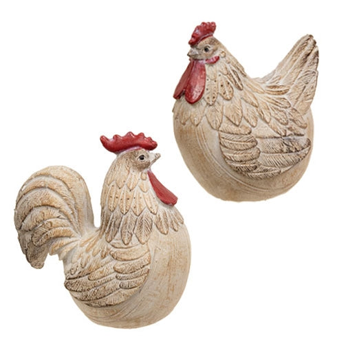 Please note: This Item features a variety of designs which are each sold individually (not as a set). Please add a note in your cart to indicate your preference. If no style is specified, one will be selected at random by our team. Antiqued Resin Carved Look Resin Chickens bring rustic farmhouse style to springtime or everyday decor. Made from resin, the chickens feature detailed carved design with a feathery texture. The figures feature a neutral light gray color with brown distressing, complete with small black eyes and red combs and wattles. One figure depicts a rooster with flowing tail feathers, and one depicts a hen. The figures each feature a flattened bottom for freestanding display. Each measures 3.5” high by 3.5” wide by 2” deep.