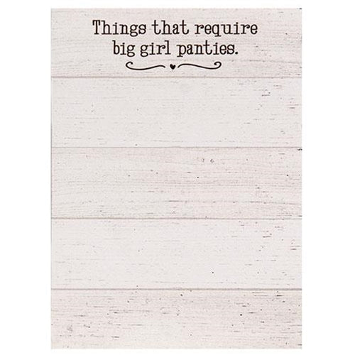 Big Girl Panties Mini Notepad is made in the USA and features 50 sheets of paper and a magnet on the back. It has a white shiplap-style background with the phrase, "things that require big girl panties" in black text and it is perfect for organizing thoughts and ideas while on the go. Measures 5.5" high by 4" wide.