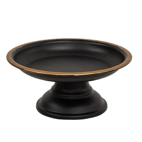 The Black & Gold Candle Pedestal is a candle holder crafted with rustic yet minimalist style. Perfect for holding a pillar candle, the pedestal features a slightly cupped shape and a tapered base. The candle holder has a rich black finish with distressed golden edges. Measures 3” high by 6.5” in diameter and holds candles up to 4.5” in diameter. Accessories not included.