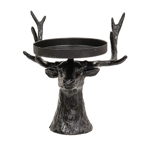 The Black Metal Reindeer Pillar Candle Holder is a unique candle holder crafted with elegant yet rustic design. The candle holder features a black base that depicts the head and neck of a reindeer with a textured finish and detailed features. Large, wide antlers protruding from each side of the reindeer’s head support a black metal candle plate. Measures 5.5” high by 5.25” wide by 4.25” deep. Candle not included.