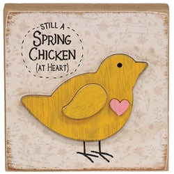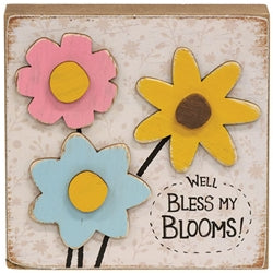 The Bless My Blooms Square Blocks are an assortment of small block signs with rustic farmhouse style. Both blocks feature a neutral floral background with a distressed finish, raw edges, and layered wood design. One block depicts a yellow chick with a pink heart detail and reads in black text, "still a spring chicken (at heart)." One block depicts a trio of yellow, pink, and blue flowers and reads in black text, "well bless my blooms!" Each measures 4" high by 4" wide by .75" deep. Please note: This Item features a variety of designs which are each sold individually (not as a set). Please add a note in your cart to indicate your preference. If no style is specified, one will be selected at random by our team.