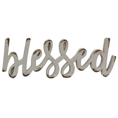 Blessed Resin Sitter is a freestanding cut-out resin sitter that reads, "Blessed" in cursive script. Features a light gray painted finish with distressing at the end of the letters for a frayed look. Measures 3.5" high 8.5" wide.