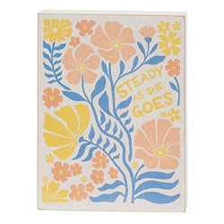 Please note: This Item features a variety of designs which are each sold individually (not as a set). Please add a note in your cart to indicate your preference. If no style is specified, one will be selected at random by our team (based on availability). The Blue Floral Blocks are an assortment of 3 springtime block signs. Each wooden rectangle has a painted front and sides, and is printed with a vintage floral design in shades of blue, peach, white, yellow, and green. One block has a white background, peach and yellow flowers, and reads “steady as she goes” in yellow. The second has a white background, blue and yellow flowers, and says “doing my best” in blue. The phrase “slow down and soak it up” is printed in yellow against a blue background, among white and peach flowers on the third block. Distressed edges add a rustic accent. Display these blocks freestanding on a table, shelf, or tray during the spring. Each block measures 6” high by 4.5” wide by 0.75” deep.