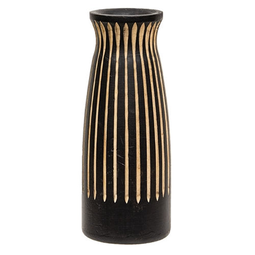 The BoHo Etched Black Wooden Vase is a unique decorative accent made with versatile wooden style. The vase features a slender shape with a matte black finish. A striped pattern carved into the vase reveals natural wood. A flat base allows for versatile display on a surface, and the vase can hold florals, picks, or other decor items. Measures 8” high by 3” in diameter. Florals not included.