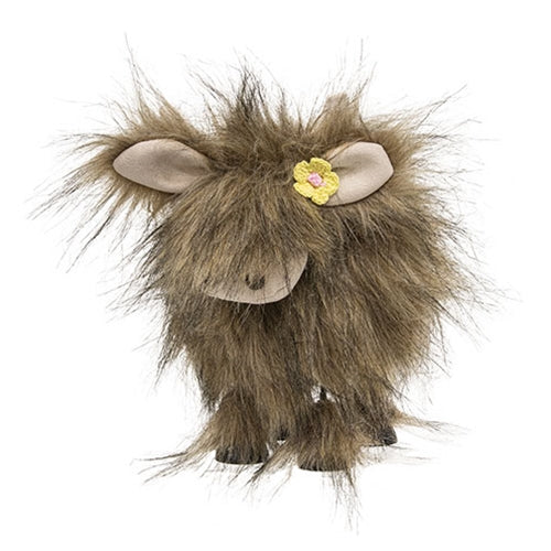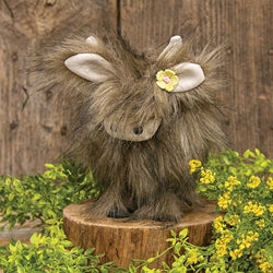 The Brown Fluffy Bobbing Highland Cow makes a darling addition to spring, summer, or year-round decor. Featuring a brown fuzzy finish, the cow is freestanding for stable display on a flat surface. A plush face complete with dark nostrils peeks through the cow’s long hair, along with ears and short horns. The cow’s head bobs for visual interest, and a small yellow flower accents one of the cow’s ears. Measures 8.5” high by 7” wide by 6” deep.