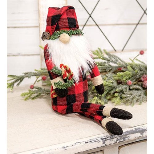 Buffalo Check Long Leg Santa Gnome with Candy Canes is a stuffed gnome doll with a weighted bottom. Gnome has a festive Santa theme and wears a red and black buffalo check suit with black boots and mittens. He holds a pine and candy cane spray in one hand and his hat has a pine band with a metal bell accent. Gnome has a dangling legs that look great hanging over the edge of a shelf or riser and he measures 16" high by 5" wide.
