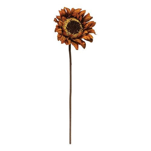 19" Burnt Orange Sunflower Stem is a burnt orange fabric sunflower with fabric leaves on a brown-wrapped wire stem. Sunflower has a dark and grungy finish that complements rustic decor and it looks great in a vase, jar, or old metal milk can. Measures 19" high by 6.5" wide.