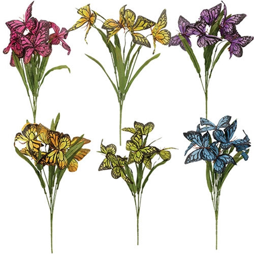 The Butterfly Spring Grass Bushes are an assortment of six decorative floral bouquets with sturdy, gathered stem bases. The sprays have long, textured grass and feature stems with fabric butterfly figurines. The butterflies have detailed wings in a variety of bright colors – orange, yellow, green, blue, purple, and pink. These butterfly bushes are whimsical and charming for spring in the home, displayed nestled inside of a pitcher, vase, or other tabletop vessel. Each bush measures 17.5” long. Please note: This item features a variety of designs which are each sold individually (not as a set).