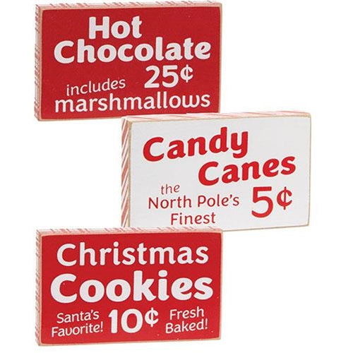 The Candy Canes, Hot Chocolate, or Cookie Blocks are an assortment of three decorative wooden blocks with a festive red and white finish. One block reads “Hot Chocolate includes marshmallows 25c”, another block reads “Candy Canes the North Pole’s finest 5c”, and the third block reads “Christmas Cookies 10c”. These blocks are a sweet, cheerful addition to the home during the Christmas season, ideal for adorning a tray or riser. Each block measures 3” high by 5” wide by .75” deep. Please note: This item features a variety of designs which are each sold individually (not as a set).