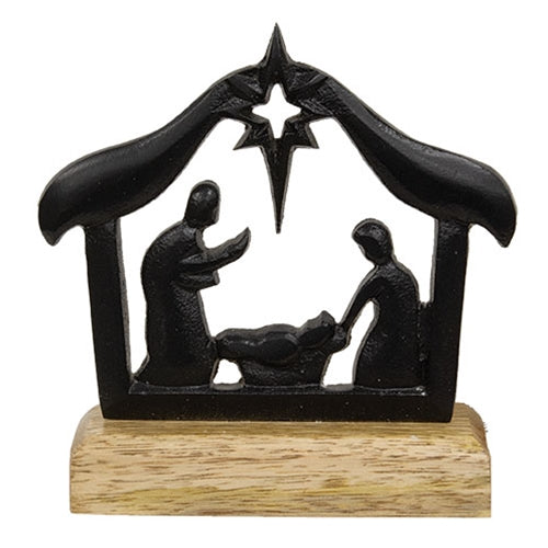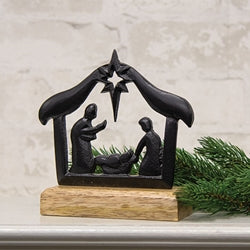 Cast Iron Nativity on Wooden Base is a bold decor piece made from cast iron and natural wood. The piece features a black cast iron depiction of the Holy family in the frame of a barn, topped with a North Star silhouette. A rectangular wood base allows for freestanding display on a flat surface. Measures 6" high by 6" wide by 2" deep.