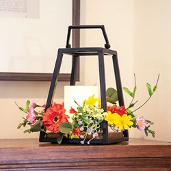 The Cast Iron & Wood Open Air Lantern is a unique and elegant pillar candle holder crafted with sleek style. The lantern features a sleek wooden platform, perfect for displaying flameless pillars and floral arrangements, surrounded by a geometric cast iron frame with a black finish. A square swing handle tops the lantern. Measures 8” high by 6” wide by 6” deep. Accessories not included.