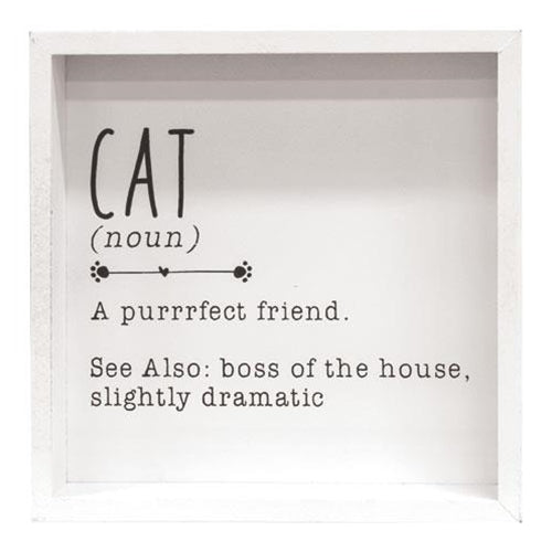 Cat Definition Framed Box Sign is a pet-themed box sign with a sawtooth hanger for wall display. Sign has a white finish and reads, "Cat (noun) A purrrfect friend. See Also: boss of the house, slightly dramatic" in black lettering and it can also be displayed freestanding on shelves and tabletops. Measures 7.90" high by 7.90" wide by 1.50" deep.