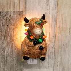 The Ceramic Holiday Highland Nightlight is a unique and versatile decor piece perfect for the winter holiday season. Crafted from ceramic with detailed design, the nightlight depicts a brown Highland cow with long hair, dark horns, and black hooves. A green wreath adorned with colorful lights is shown around the cow’s neck, and a small sprig of holly with red berries sits between his horns. A 7W bulb sits inside of the figure, powered by a standard 2-prong plug. The convenient power switch allows for easy on and off. Measures 6” high by 2.5” wide by 2.25” deep.