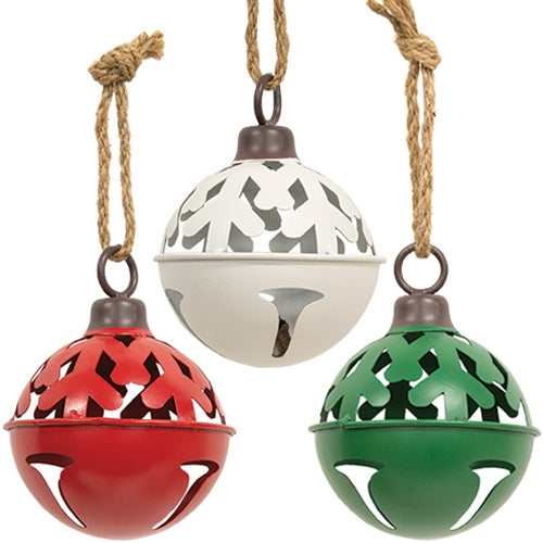 Christmas Tree Cutout Jingle Bell Ornaments are decorative metal jingle bells hung from jute rope. The bells feature a coat of solid paint in assorted colors of white, red, or green with wintry cutout design. Each contains a smaller bell inside to procuce an audible jingle. Each measures 5.5" high by 4.25" in diameter. Please note: This item features a variety of designs which are each sold individually (not as a set).