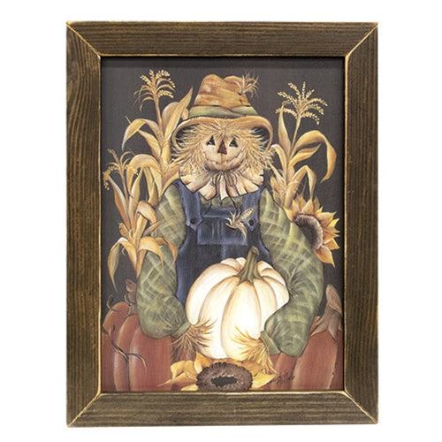 The Country Scarecrow Framed Print brings vintage-inspired style to fall farmhouse decor. The framed art piece depicts a scarecrow sitting among cornstalks and pumpkins, wearing a green plaid flannel, denim overalls, and a straw hat. A dark wood frame with a distressed finish completes the piece, and a keyhole hanger on the back allows for easy display. Measures 17.5" high by 13.5" wide by .5" deep. Made in the USA!