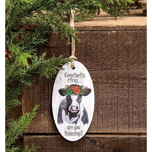 The Cowbells Ring Ornament is a tall, thin oval-shaped wooden slice ornament with a distressed white background. The ornament reads "Cowbells ring...are you listening?" in black lettering and displays a black and white spotted cow with a poinsettia crown. The top of the ornament includes a jute rope loop, perfect for using to display the ornament on a Christmas tree during the holiday season. Measures 4.75" high by 2.5" wide by .25" deep.