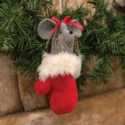 The Cozy Mary Mouse in Red Mitten Hanger is a vintage inspired accent for festive winter decor. The hanger features a red mitten with a velvet finish and a fuzzy white cuff. A fuzzy gray fabric mouse is shown peeking out of the stocking, wearing a red hair bow. The mouse’s face features black bead eyes, a black pom nose, and dried grass whiskers. A red cord attached to the back of the mitten allows for easy hanging display. Measures 7” high by 3.5” wide by 2” deep. Made in the USA!