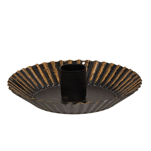The Distressed Black & Gold Metal Taper Tart Pan is an eye-catching candle holder made with rustic design. The metal pan features crimped edges and a cup that holds a 1” taper. Matte black design with gold distressing gives the pan a unique look perfect for vintage, shabby chic, or glamorous decor. Measures 1.25” high by 5” in diameter. Accessories not included.