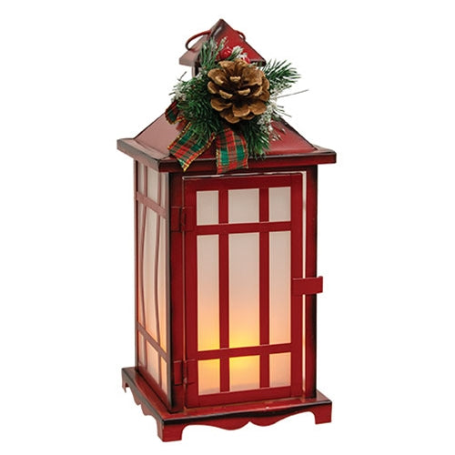 The Distressed Red Metal Fireglow Lantern is a decorative tabletop lantern with cozy wintry style. The lantern features a distressed red finish and is adorned with a red and green plaid bow, snow-kissed greenery, a pinecone, and berries. Powered by 3 AAA batteries, a fire-like glow emits from within the lantern. Measures 10" high by 5" wide by 5" deep.