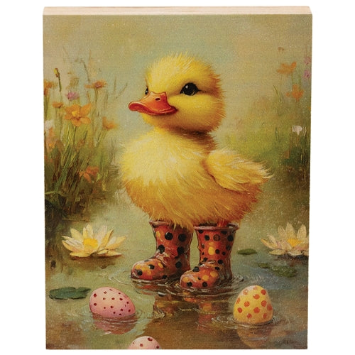 The Duckling in Black & Yellow Polka Dot Rainboots Block is a freestanding wooden block made with charming springtime style. With detailed printed design, the block depicts a yellow duckling standing on wet ground. Yellow lilies, green lily pads, and pink and yellow Easter eggs sit on the ground while tall green grass and orange and pink flowers are shown in the background. The duck wears sweet pink rainboots with black and yellow polka dots. Measures 6” high by 4.5” wide by .5” deep.