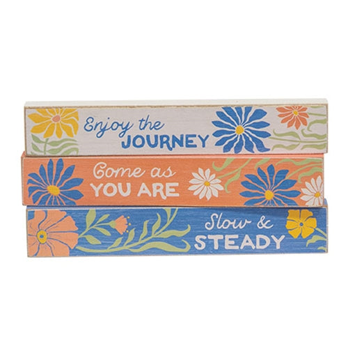 Please note: This Item features a variety of designs which are each sold individually (not as a set). Please add a note in your cart to indicate your preference. If no style is specified, one will be selected at random by our team (based on availability). The Enjoy the Journey Mini Sticks are an assortment of 3 wooden block signs. Each design features a painted front and sides with a graphic floral print in bright blue, peach, yellow, white, and green. The white block says “enjoy the journey” in blue, peach block reads “come as you are” in white, and the blue block features white text that says “slow & steady.” Distressed edges add a rustic finish. These blocks are an encouraging addition to springtime decor, displayed freestanding on a shelf, table, or mantel. Each block measures 1” high by 6” wide by 0.5” deep.