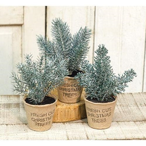 Frosted Tree in Paper Cups comes in 3 assorted styles (sold separately), each with a different faux evergreen plant that is frosted for the season. The rigid paper containers are printed with the words "Fresh Cut Christmas Trees". The tree in cup measure approximately 7" to 7½" tall and the cup has a 3" diameter at the top. Please note: This item features an assortment of designs which are each sold individually (not as a set.)