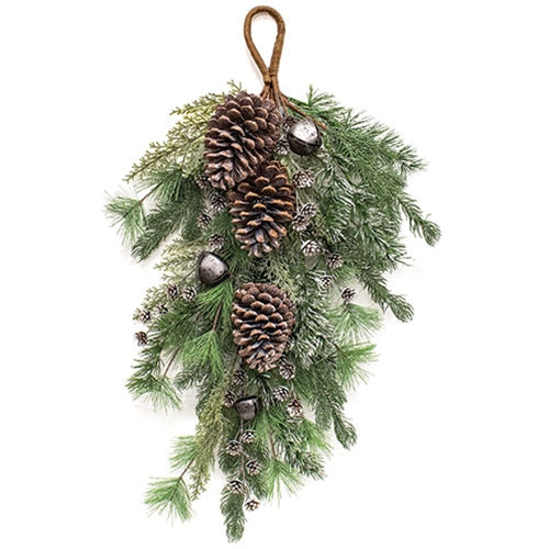 The Frosty Cheer Teardrop is a decorative floral teardrop piece with a natural, brown-wrapped base. The teardrop is filled with lush pine greenery, rustic brown pinecones, and features vintage silver jingle bells, all dusted with a coat of white flocking for a fresh snow-dusted look. Display this teardrop using the loop hanger at the top, bringing a wintry woodland accent to a door or wall. Measures 28” long by 16” wide by 4” deep.