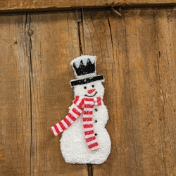 The Fuzzy Glittered Snowman Hanger is a friendly, festive decor piece ready to hang on a holiday tree, door, or wall. The hanger features the shape of a classic 3-tiered snowman in a bright shade of white. A trio of black buttons adorn the snowman’s body and he’s fitted with black and orange facial features. The snowman wears a black top hat and a red and white striped knit scarf. Iridescent glitter adds a snowy finish, and a clear string hanger allows for easy display. Measures 8.75” high by 4” wide by .25” deep.