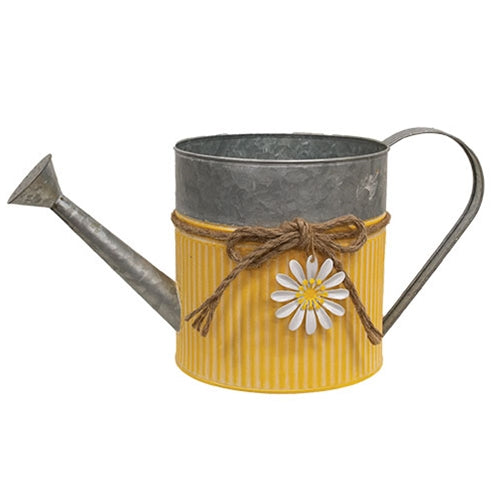 The Watering Can with Daisy is a decorative and functional metal watering can with a galvanized gray finish. The body of the watering can has a ribbed texture and bright yellow color, accented with a jute bow wrap and white and yellow metal daisy charm. Fill this can with florals, greenery, or plush for a cheerful spring display, or use functionally and place on a porch or bench. Measures 7.5” high by 16” wide by 7” deep.