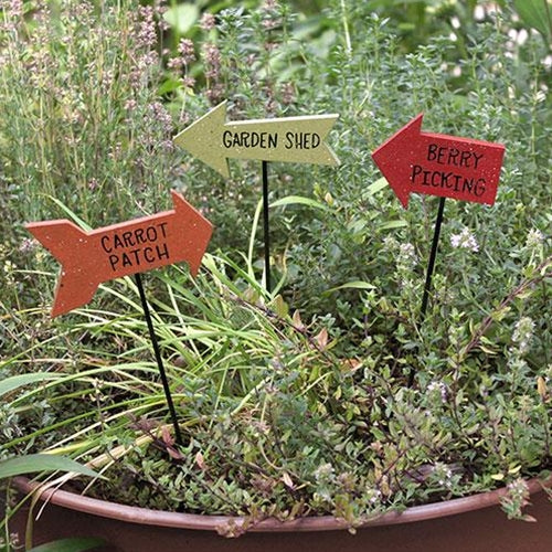 Garden Arrow Plant Poke sells as an assortment of three wooden stakes. Poke has an arrow shape and design and it comes ready for display by a long and slim metal stem. Poke reads, "carrot patch," "berry picking," or, "garden shed" in black text and it looks great displayed in cans, pitchers, or vases. Measures 9.75" high by 4" wide by .25" deep. Please note: This item features an assortment of designs which are each sold individually (not as a set).