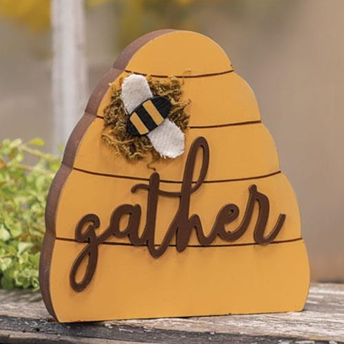 Gather Chunky Beehive is a freestanding beehive sitter. Beehive is made of wood and reads, "gather" in script lettering with a bumble bee accent. It has a brown and yellow finish and works with any spring and rustic decor. It has a flat base for use on shelves, mantels, or countertops and measures 6" high by 5" wide by 1.25" deep.