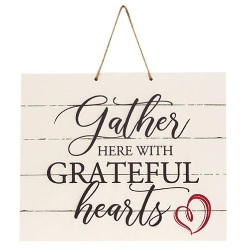 Gather Here With Grateful Hearts Horizontal Pallet Board Rope Sign is a USA made sign with a white print and a jute rope hanger. Sign reads, "gather here with grateful hearts" in black text with a red heart accent and it measures 11.75" high by 15" wide.