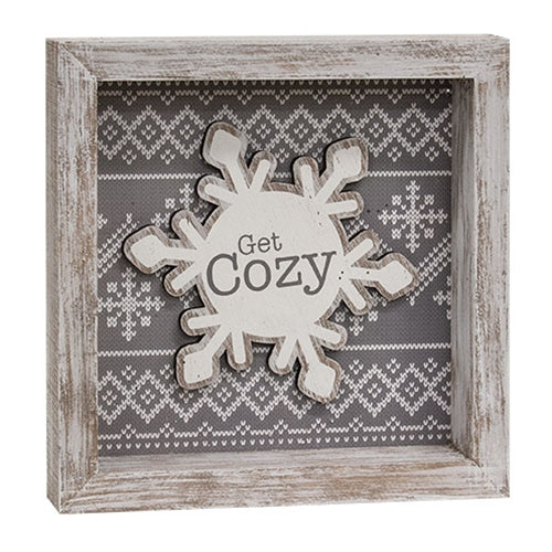 Get Cozy Snowflake Sweater Frame is a cozy seasonal decor piece crafted from wood. The layered design depicts a white snowflake centered on a gray sweater-inspired background. The snowflake features a distressed finish and gray print that reads, get cozy. An attached sawtooth hanger allows for easy wall display. Measures 8 in. high by 8 in. wide by 1.5 in. deep.