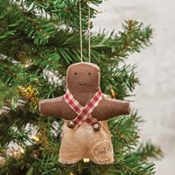 Gingerbread Cookie Girl Ornament is a stuffed primitive ornament with a jute hanger. Ornament is brown and has red and white gingham straps with jingle bell buttons and a burlap skirt that reads, "cookies." Measures 5.5" high by 5" wide by 1.25" deep.