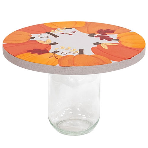 The Glass Jar with Fall Topper is a unique and versatile decorative container that adds height to fall displays. The set includes a wide mouth glass jar, and a round wooden topper with a cork plug that fits in the jar. Painted design completes the topper, depicting a ring of pumpkins in various shades of orange against a soft gray background. Fall leaves and vines accent the pumpkins, and the edges and underside are painted gray. The jar can be filled with string lights, an electric tealight or votive candle, or decorative bowl filler. The jar measures 5” high by 3” in diameter, and the topper measures 1.25” high by 8” in diameter.