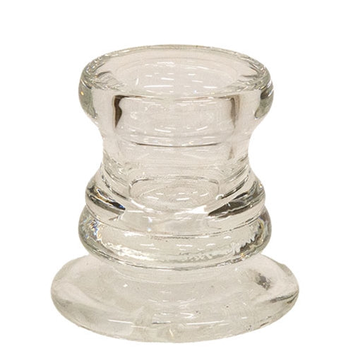 The Glass Taper Holder is a decorative taper candle holder made of thick, durable clear glass. The holder has a traditional silhouette and fits with a variety of styles and seasons in the home. Pair this holder with a taper candle and display atop a shelf or table year-round. Measures 2” high and 2” in diameter.