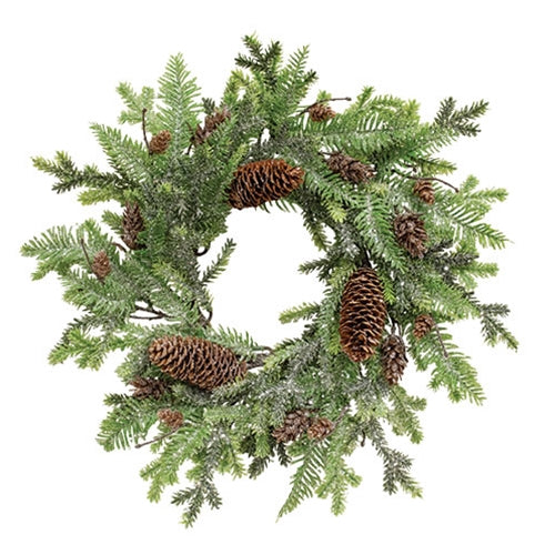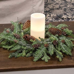 The Glittering Millwood Wreath is a decorative greenery wreath with a brown twig-like base. The wreath is full of textured pine branches and rustic pinecones in varying sizes, all dusted with silver glitter for a freshly frosted look. Display this wreath hanging on a door or wall to bring a festive woodland welcome to the home during the Winter and Christmas season. Measures 5.5” in diameter (inner) and approximately 16-18" in diameter (outer). Candle sold separately.