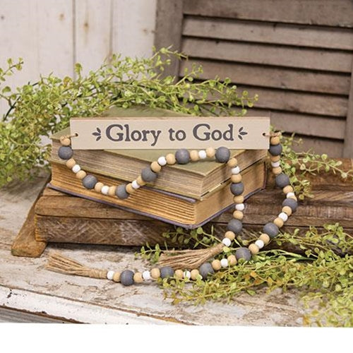 The Glory To God Garland Sign is a decorative tabletop piece featuring a rectangular wooden cutout, painted ivory and reading "Glory to God" in gray letters. The sign has two jute rope strings tied to either end, decorated with white, gray, and natural wood beads and two jute tassels. This sign can be displayed freestanding, as an addition to any mantle, shelf, desk, windowsill, or tabletop. Measures 45" long and 1.75" high by .75" deep.