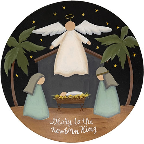The Glory to the Newborn King Nativity Plate is a decorative accent made with darling seasonal design. The plate depicts a nativity scene complete with Mary, Joseph, an angel, and baby Jesus in a manger. The scenery includes palm trees and a night sky full of stars. White script reads, "glory to the newborn king." Made from wood, this plate features painted deisgn and is intended for decorative use only. Measures 11.5" in diameter by 1" deep.