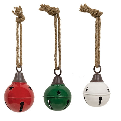 Glossy Metal Jingle Bell Ornaments are decorative metal jingle bells hung from jute rope. The bells come in assorted colors of red, white, and green and have a classic vintage design accented by star cutouts. Metal ball inside allows for a festive ringing sound. Each measures 5" high by 3" in diameter. Please note: This item features a variety of designs which are each sold individually (not as a set).