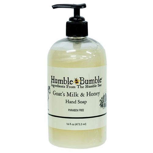Goat's Milk and Honey Hand Soap is a thick and creamy hand soap made with natural ingredients derived from bumblebees. Soap has a sweet, goat's milk and honey scent and is paraben free. Item includes a pump and comes in a 16 fluid ounce plastic bottle. Made in the USA.