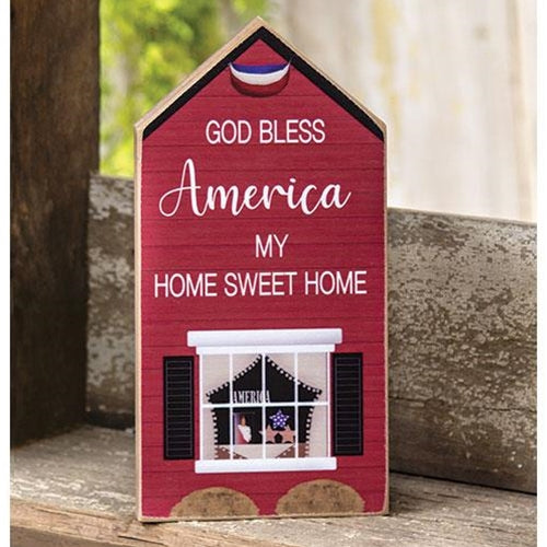 God Bless America House Sitter is a freestanding wood accent with a house shape and design. Sitter is red with unpainted sides and it reads, "God Bless America My Home Sweet Home" in white lettering. Sitter looks great on shelves, tabletops, and counter tops and it measures 9.75" high by 5" wide by 0.75" deep.