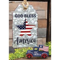 God Bless America Metal Tag w/ Jute is made of galvanized metal and features distressed edges for a vintage look. It is embossed with text and a painted patriotic star and reads, "God Bless America" in a navy blue finish. Tag has a jute rope hanger attached at the top for wall display and it measures 12" high by 7" wide.
