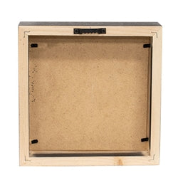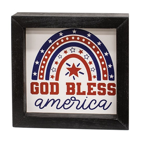 The God Bless America Shadowbox Frame is a wooden decor piece perfect for hanging or freestanding patriotic display. The framed art features a white background and depicts a red and blue rainbow with white dot and star details. A red star with blue flourishes sits under the center of the rainbow, and text reads “God bless America” in a mix of red block and blue script fonts. The black wooden shadowbox frame completes the piece and features an attached sawtooth hanger. Measures 7” high by 7” wide by 2” deep.