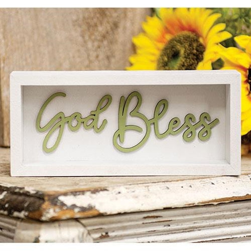 God Bless Shadowbox Frame is a wooden box sign with a distressed white finish. Shadowbox reads, "God Bless" in dimensional green lettering and it comes ready for wall display by its pre-installed sawtooth hanger. Measures 3.5" high by 8" wide by 1.5" deep.